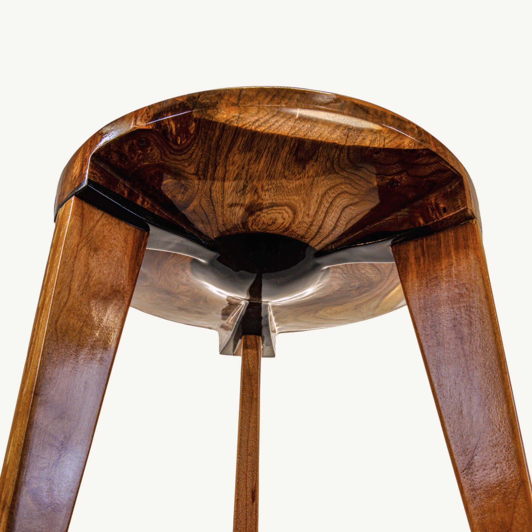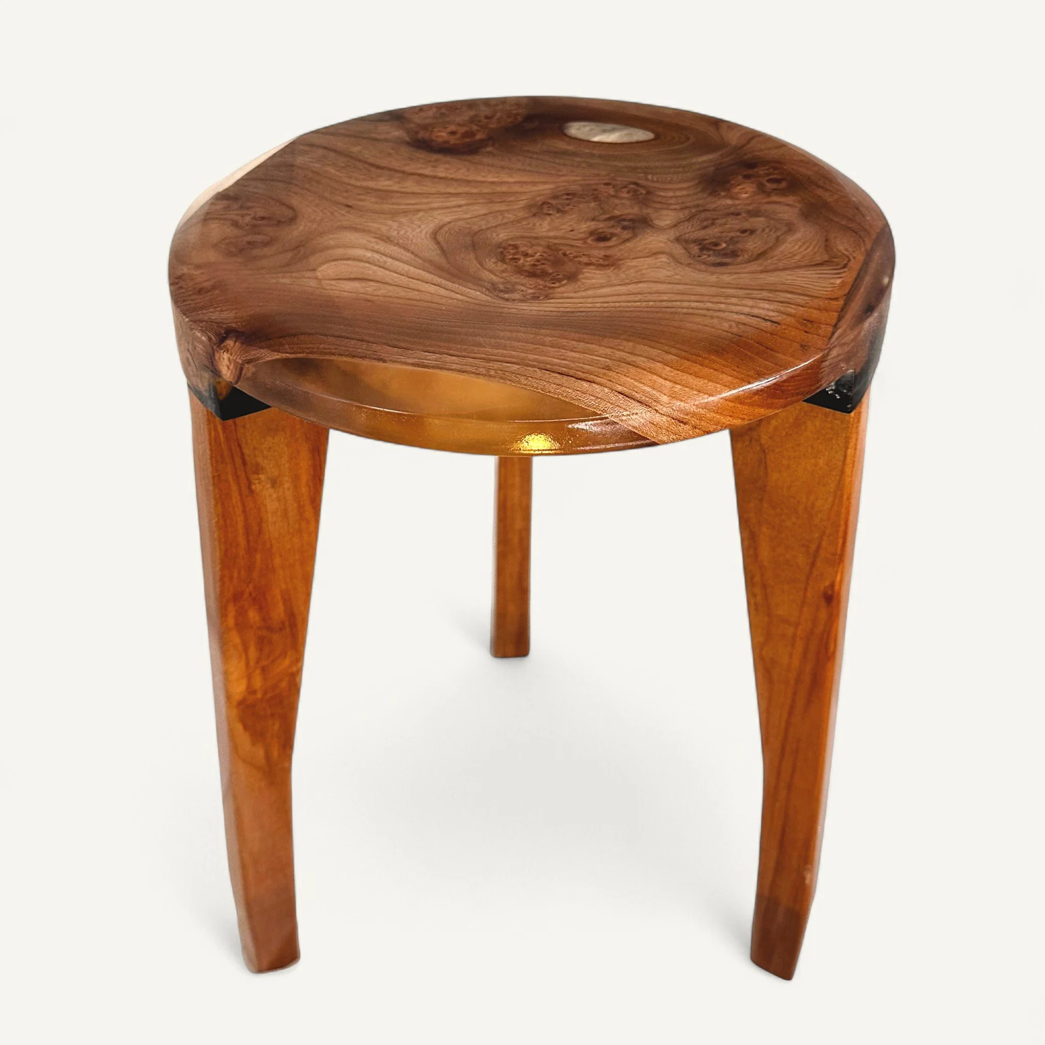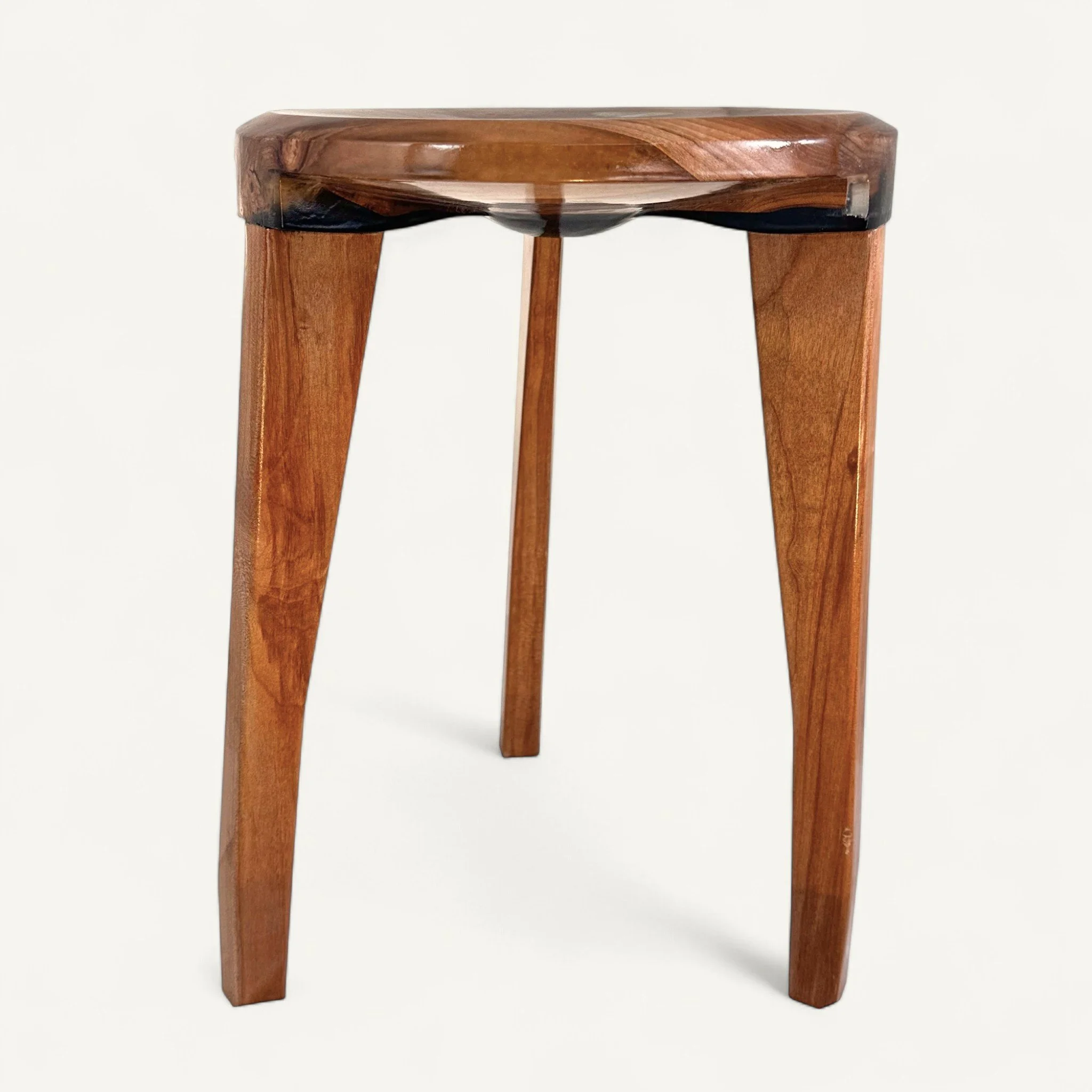 Crafted from elm and maple, the stool carries the warmth of natural wood, shaped by hand so that each curve follows its own grain. A distinctive epoxy resin surface contrasts with the warm grain, celebrating both tradition and innovation. No two stools are exactly alike — each one carries its own voice.